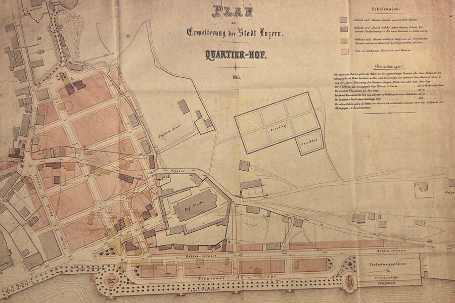 Mit dem städtischen Bauplan von 1865 erhielt diese Entwicklung eine noch nie gesehene Grösse. Nachdem die Stadt mit der Alpenstrasse 1859 eine Verbindung vom Seeufer bzw. Schweizerhofquai, dem damaligen touristischen Zentrum Luzerns, zum Wey geschaffen hatte, erklärte der liberale Stadtrat gemeinsam mit den Hoteliers den Wey zum «grossstädtisch geplanten Fremdenquartier» und kaufte grosse Landparzellen im Quartier Hof.